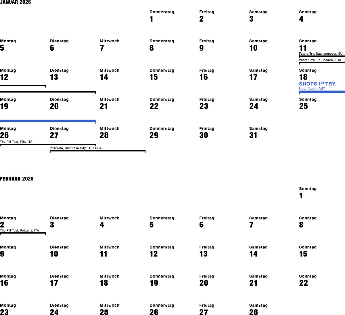 Vom Sonntag, dem 18. Januar 2026, bis zum Dienstag, dem 20. Januar 2026. Als Snowboard-Händler kannst du frei wählen, an welchen Tagen du gerne am Event teilnehmen möchtest. Wir bemühen uns, den Termin so zu legen, dass er nicht mit anderen Händlerveranstaltungen kollidiert. Zur besseren Übersicht findest du im untenstehenden Kalender weitere Messen und On-Snow-Demos.