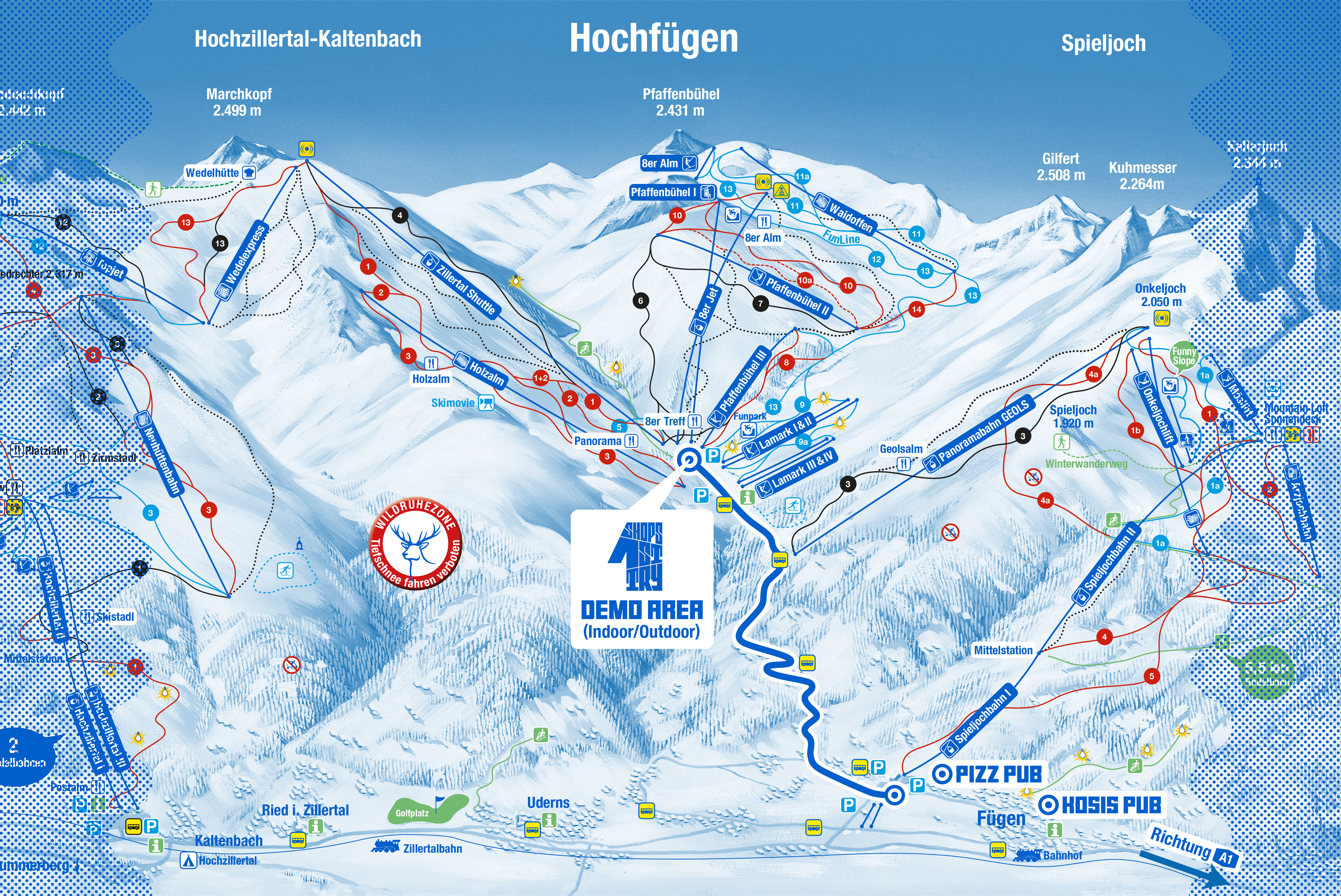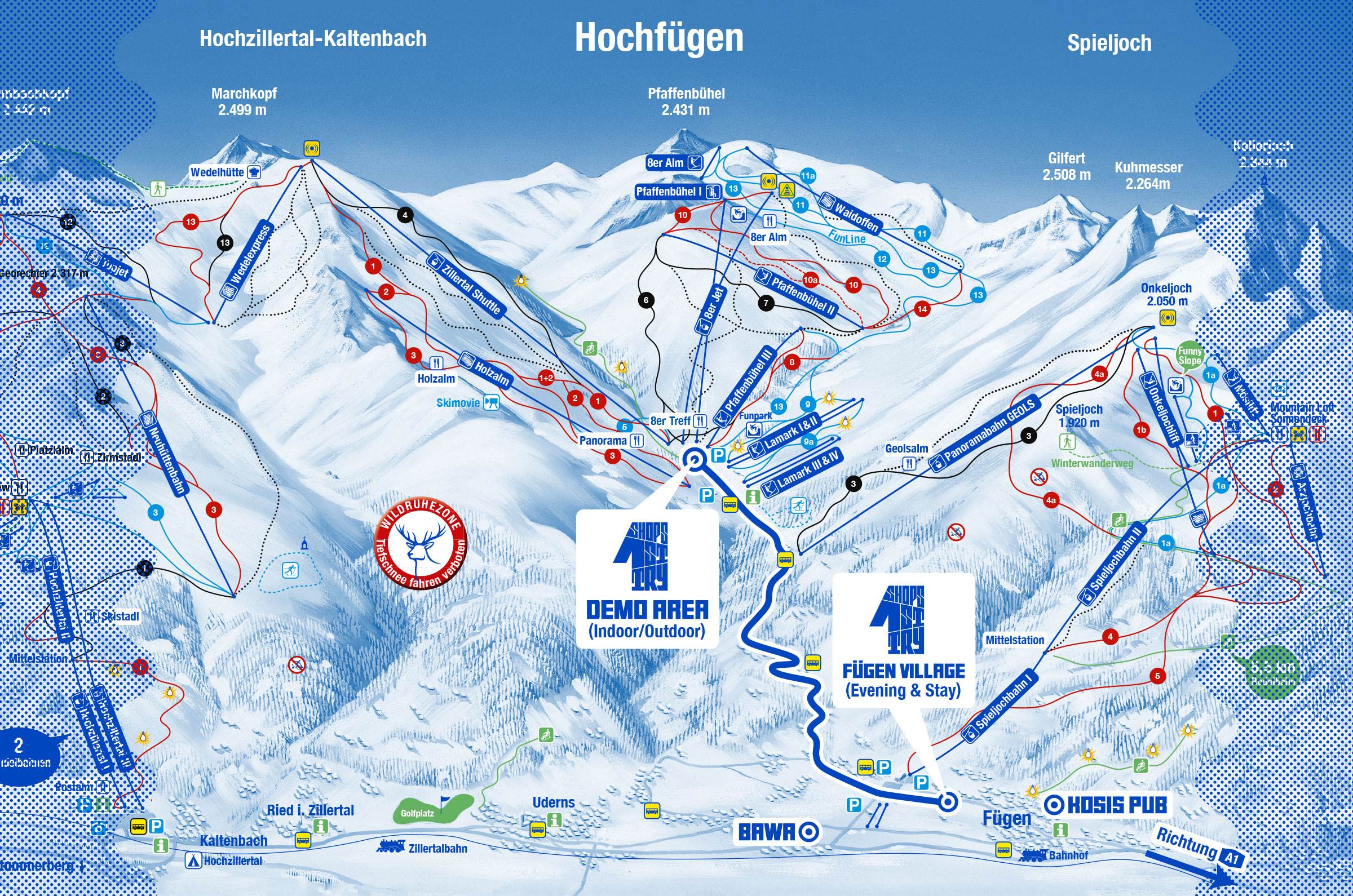 Um zur Indoor und Area und zu den Seilbahnen in Hochfügen zu gelangen, benötigt man mit dem Auto etwa 15 Minuten. Wir empfehlen den Skibus oder die eigens eingerichteten SHOPS 1ST TRY Shuttle-Busse, die regelmäßig zwischen Fügen und Hochfügen verkehren. Klicke hier für den Bus Fahrplan!