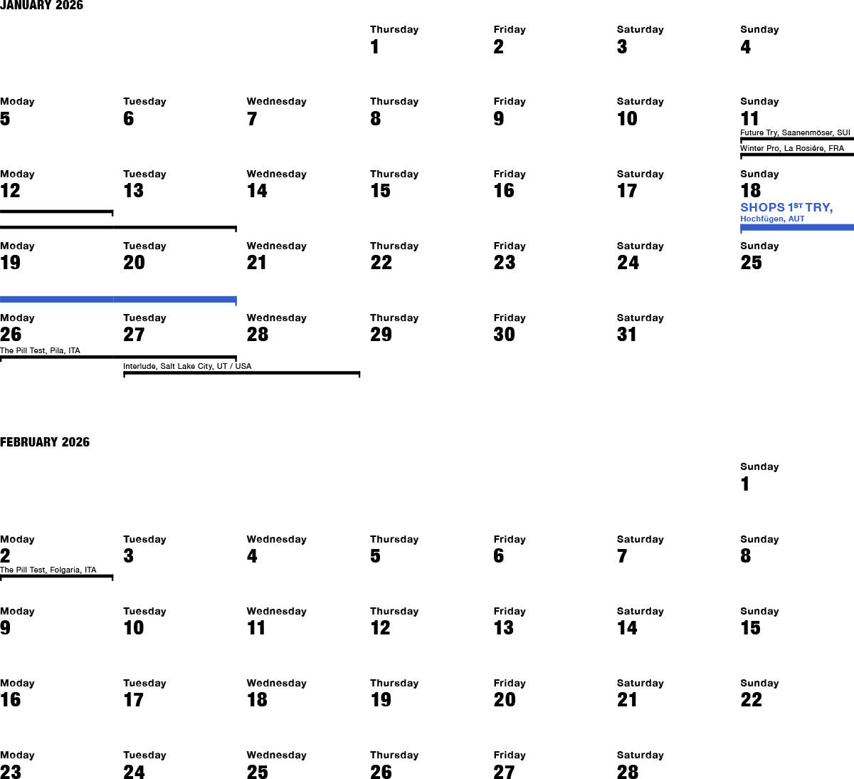 From Sunday January 18, 2026 to Tuesday January 20, 2026. As a snowboard retailer, you are free to choose which days you would like to take part in the event. We will endeavor to schedule the event so that it does not clash with other retail events. For a better overview, you can find more trade fairs and on-snow demos in the calendar below.